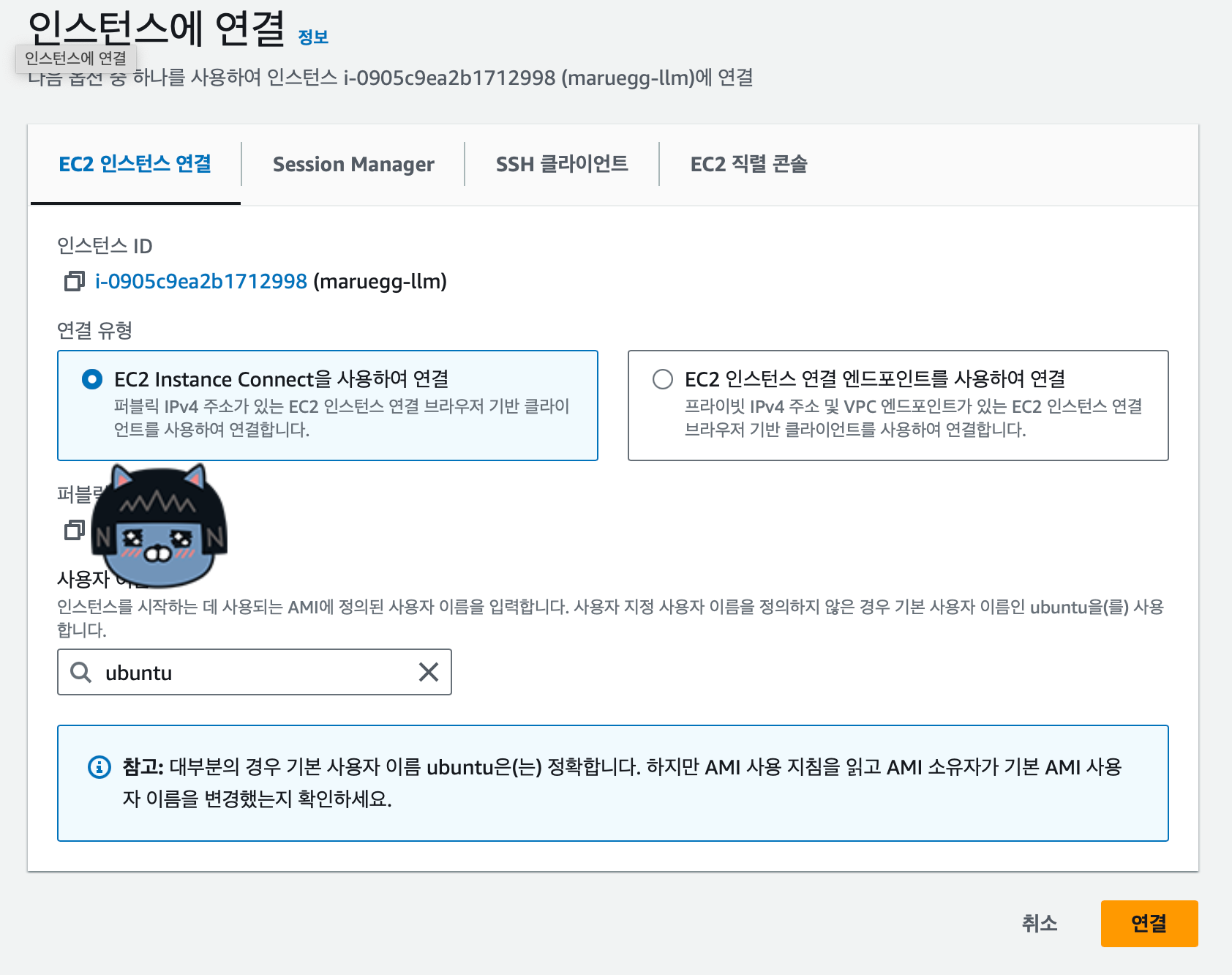 인스턴스를 클릭하고 "연결"버튼을 누르자