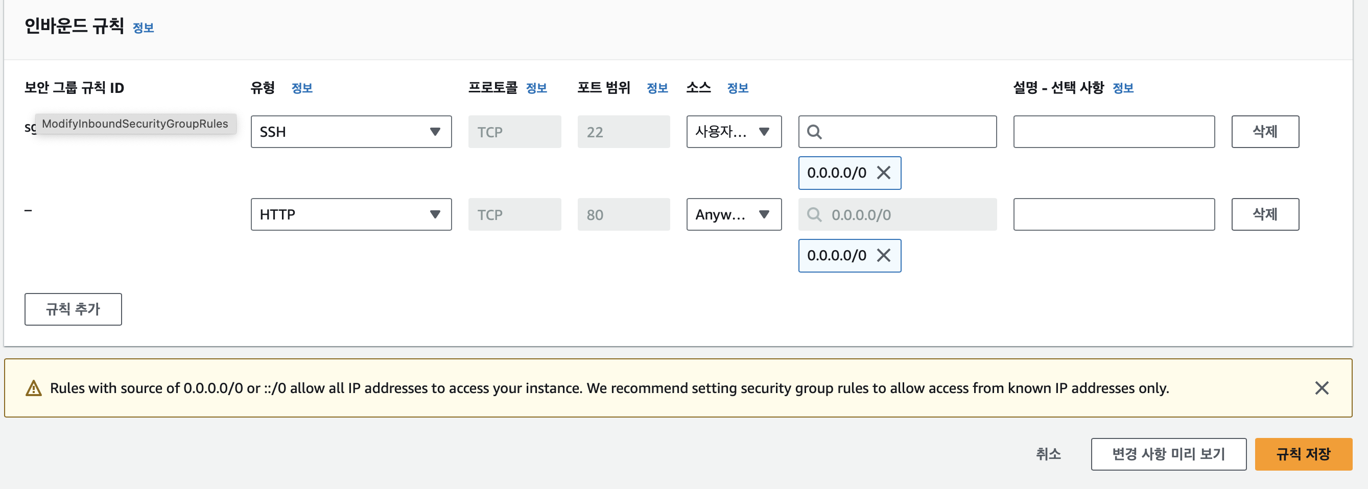 이전 사진에서 보이는 "인바운드 규칙 편집" 클릭 > 위 사진에서 "규칙추가"클릭