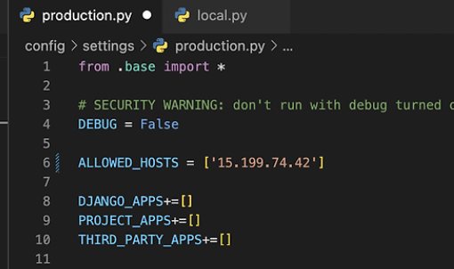 하나 깜박한 것이 있다. 우리의 프로젝트 production.py에 들어가서 다음과 같이 ALLOWED_HOSTS에 본인 ec2 ip주소를 꼭 넣어주자