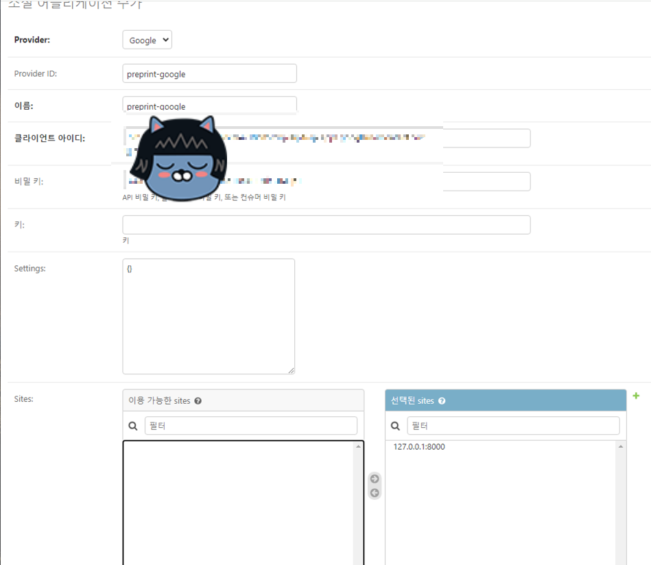 => 이렇게 구글 oauth에서 발급받은 정보를 입력해 주고, 사이트의 경우는 더블클릭하여 오른쪽으로 옮겨준다.