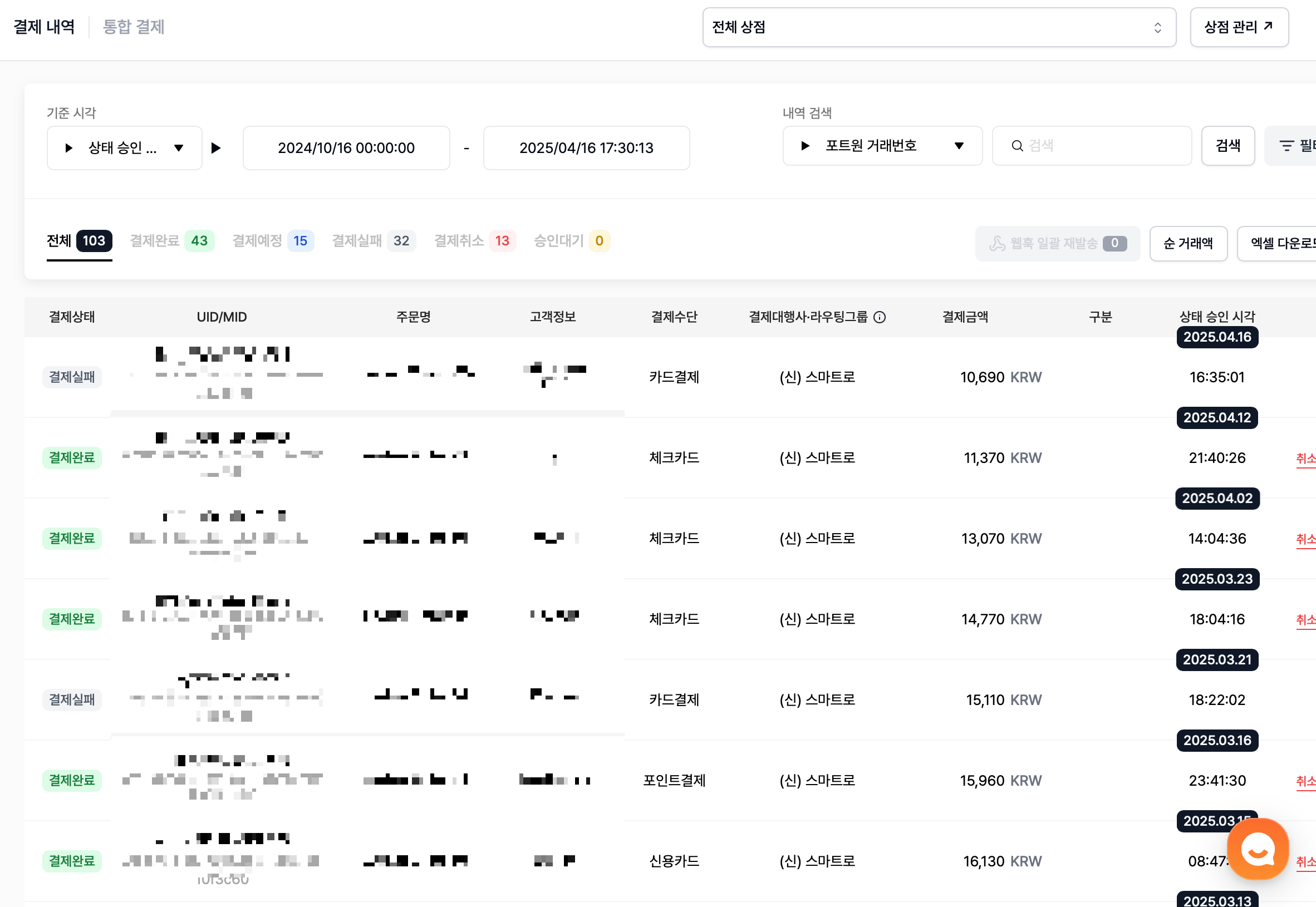 => 정말 다행스러운것은 서비스 운영중 결제, 결제 실패, 결제 취소 부분에 있어서 문제는 단 한건도 일어나지 않았다.